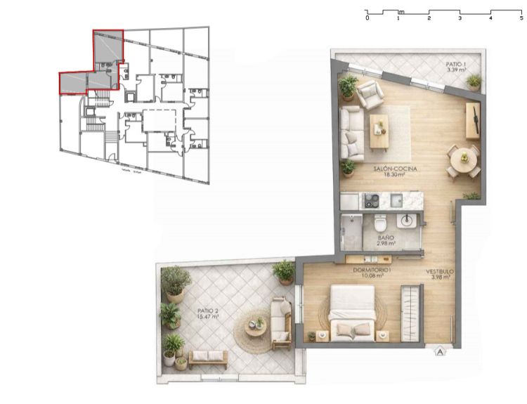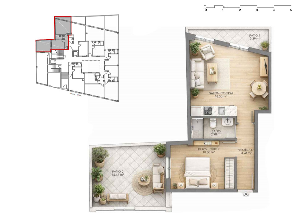 | Inmueble | M2 cons. | Dorm. | Baños | M2 patio | Precio € (sin IVA) |